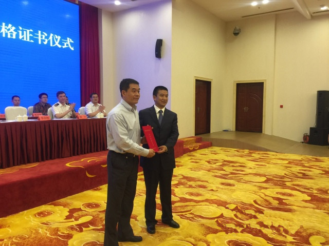 聯(lián)合驗(yàn)收組組長、海關(guān)總署加貿(mào)司李志輝副司長向昆明綜合保稅區(qū)管委會(huì)專職副主任張宏頒發(fā)合格證書