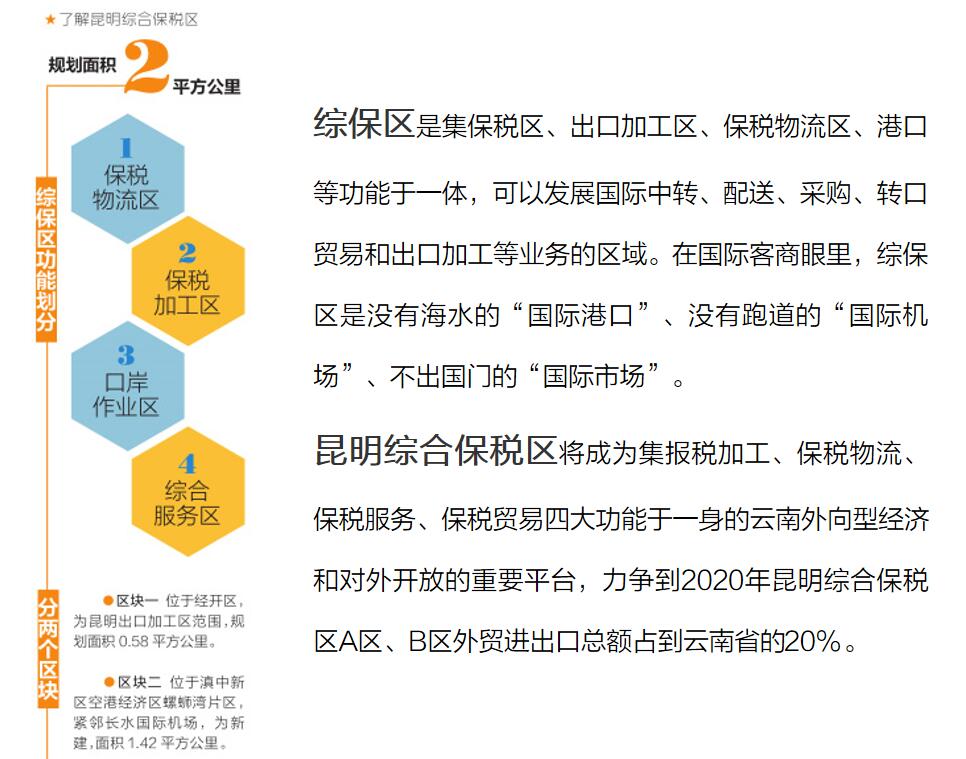 昆明綜合保稅區(qū)規(guī)劃面積2平方公里,按功能劃分為保稅物流區(qū)、保稅加工區(qū)、口岸作業(yè)區(qū)、綜合服務(wù)區(qū)。又分為兩個(gè)區(qū)塊,區(qū)塊一位于經(jīng)開區(qū),為昆明出口加工區(qū)范圍,規(guī)劃面積0.58平方公里。區(qū)塊二位于滇中新區(qū)空港經(jīng)濟(jì)區(qū)螺螄灣片區(qū),緊鄰長水國際機(jī)場,為新建,面積1.42平方公里。