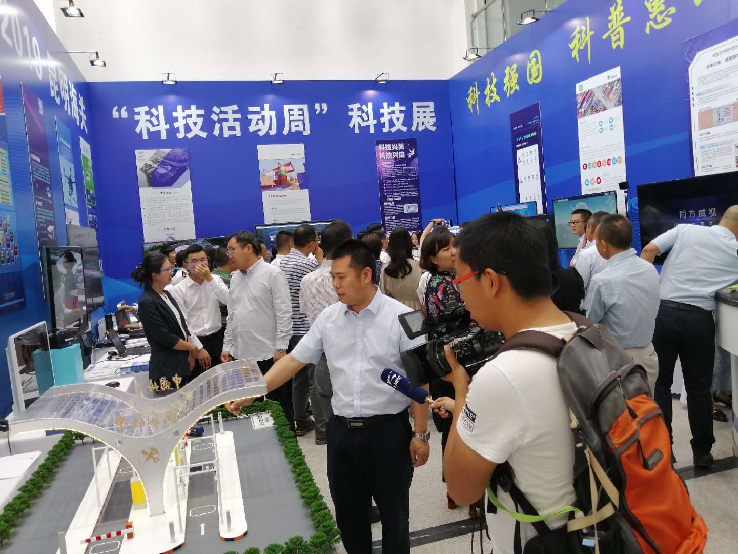 2019昆明海關(guān)“科技活動周”科技展于5月20日至5月26日在昆明海關(guān)一樓大廳正式開啟。本次活動周圍繞“科技強國、科普惠民”的主題,通過展板、展臺、體驗式交互等方式,對科技創(chuàng)新助力云南口岸通關(guān)便利化的發(fā)展歷程、重大成果以及未來規(guī)劃進行了展示?;顒蝇F(xiàn)場航通展出了所開發(fā)的云卡口系統(tǒng)等智能化軟硬件設(shè)備、全景業(yè)務(wù)監(jiān)測平臺、跨境電商解決方案以及邊民互市貿(mào)易申報系統(tǒng)等全套解決方案。