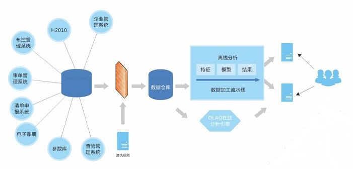 系統(tǒng)整合現(xiàn)有H2010通關管理系統(tǒng)和各信息系統(tǒng)的數(shù)據(jù),通過添加智能對象特征實現(xiàn)各類數(shù)據(jù)的分類;通過數(shù)據(jù)建模實現(xiàn)分析方法的模塊化、程序化、可視化;利用大數(shù)據(jù)云計算功能實現(xiàn)數(shù)據(jù)的智能分析和加工,按照異動信息、一般貿(mào)易風險分析、加工貿(mào)易風險分析和主要稅源商品風險分析四大門類進行結果展示。